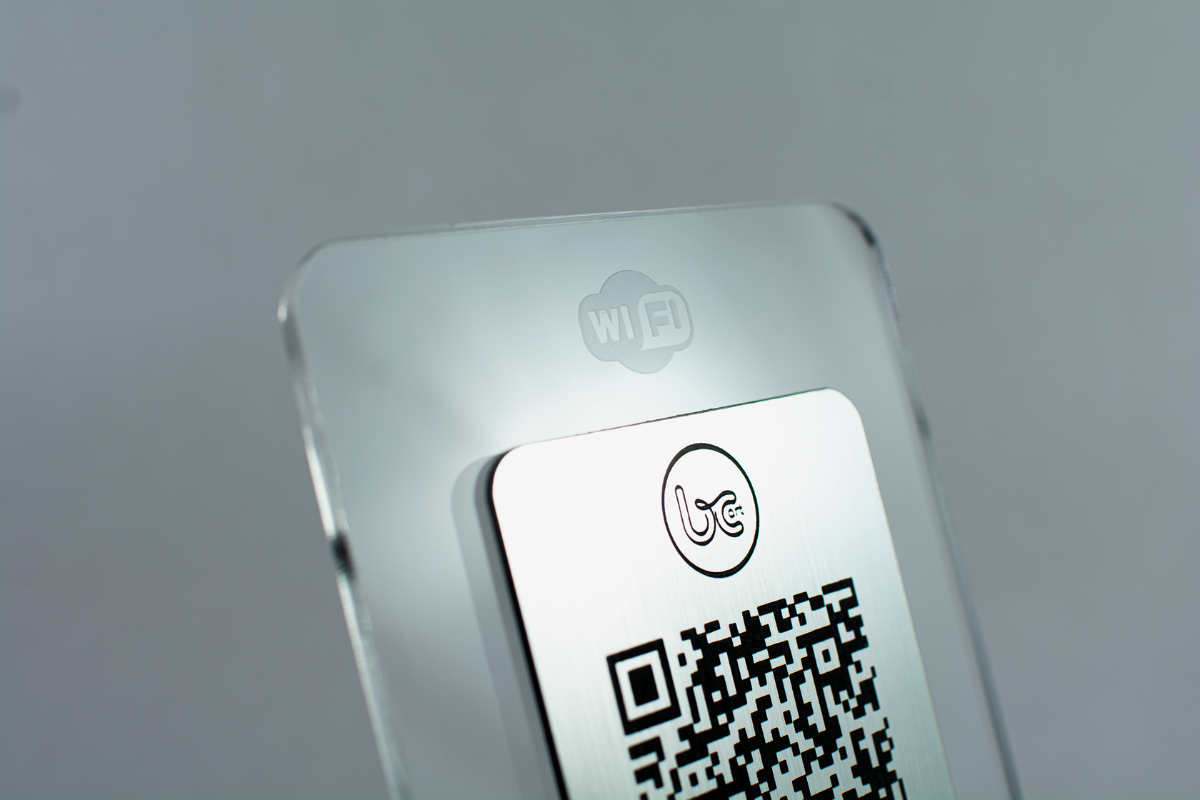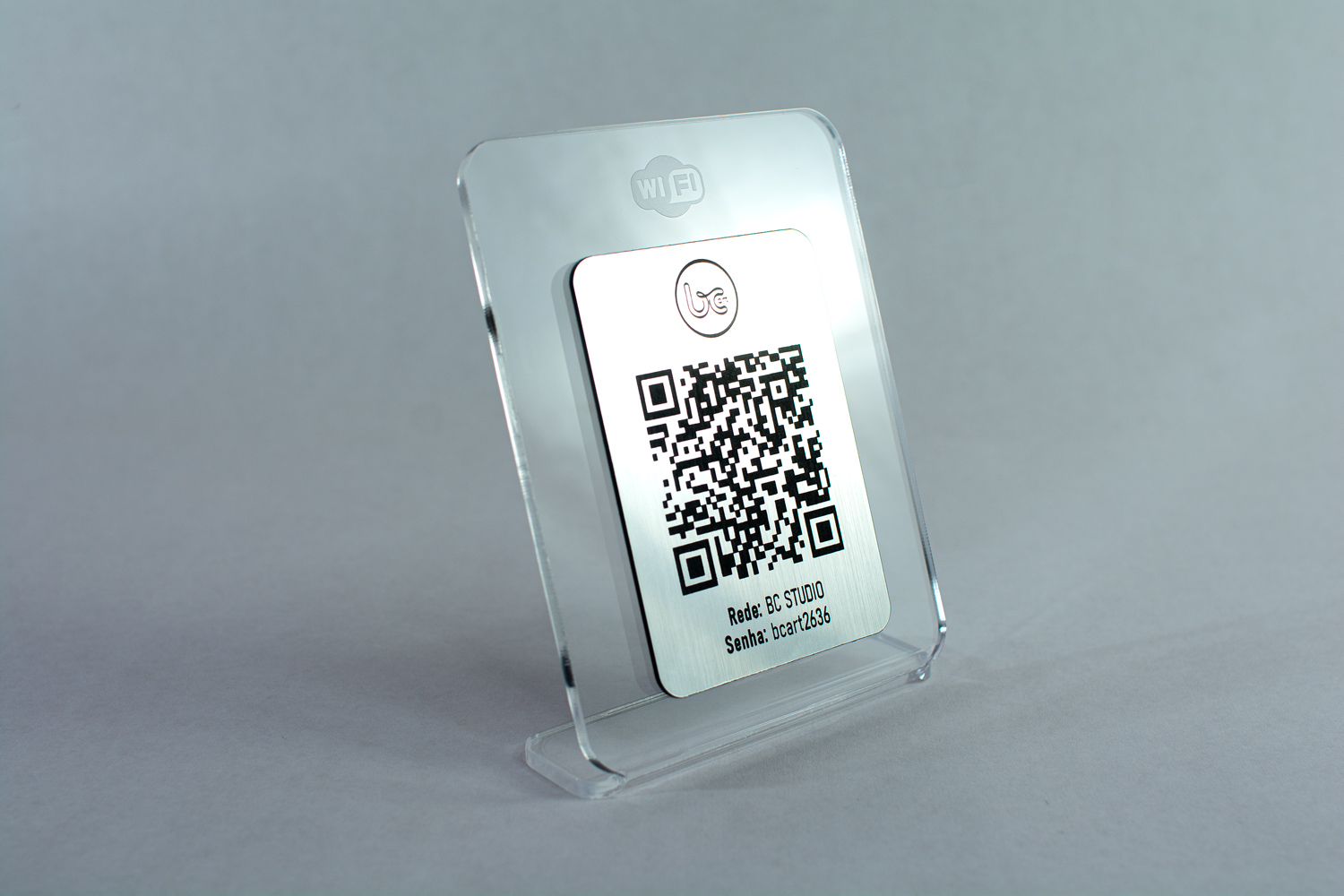 Nossa placa de QR Code Wi-Fi em acrílico com gravação a laser permite que seus clientes conectem à internet em segundos — basta apontar a câmera do celular e pronto.