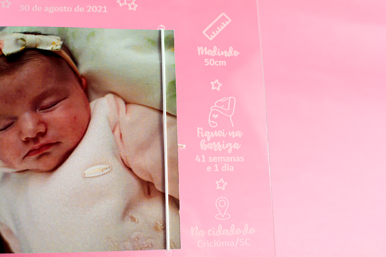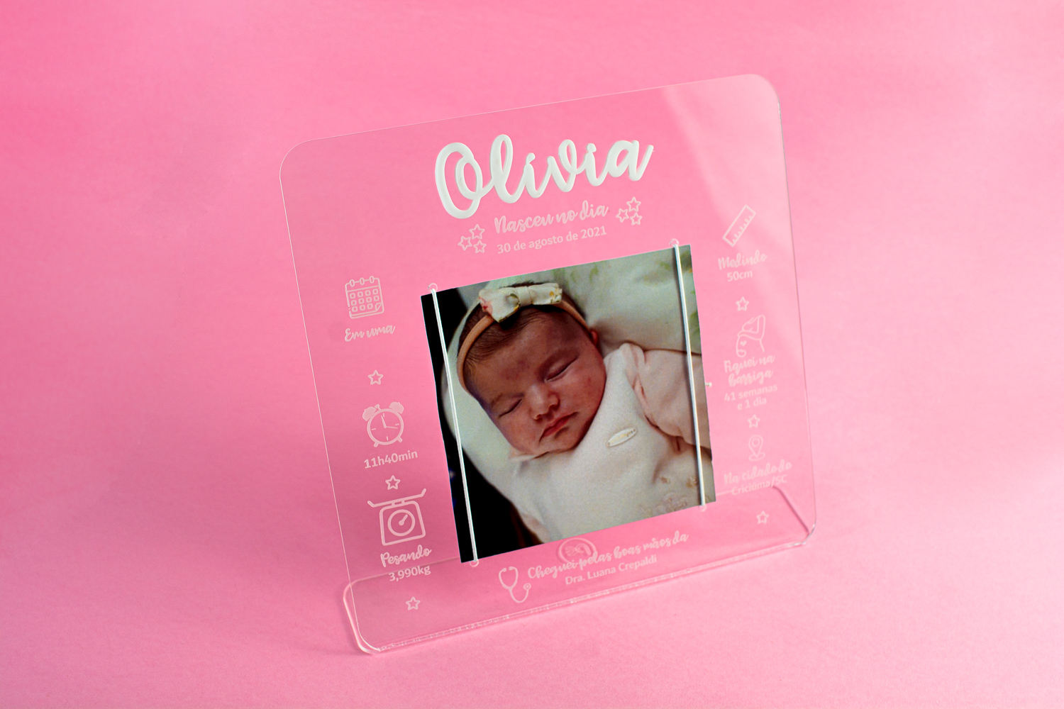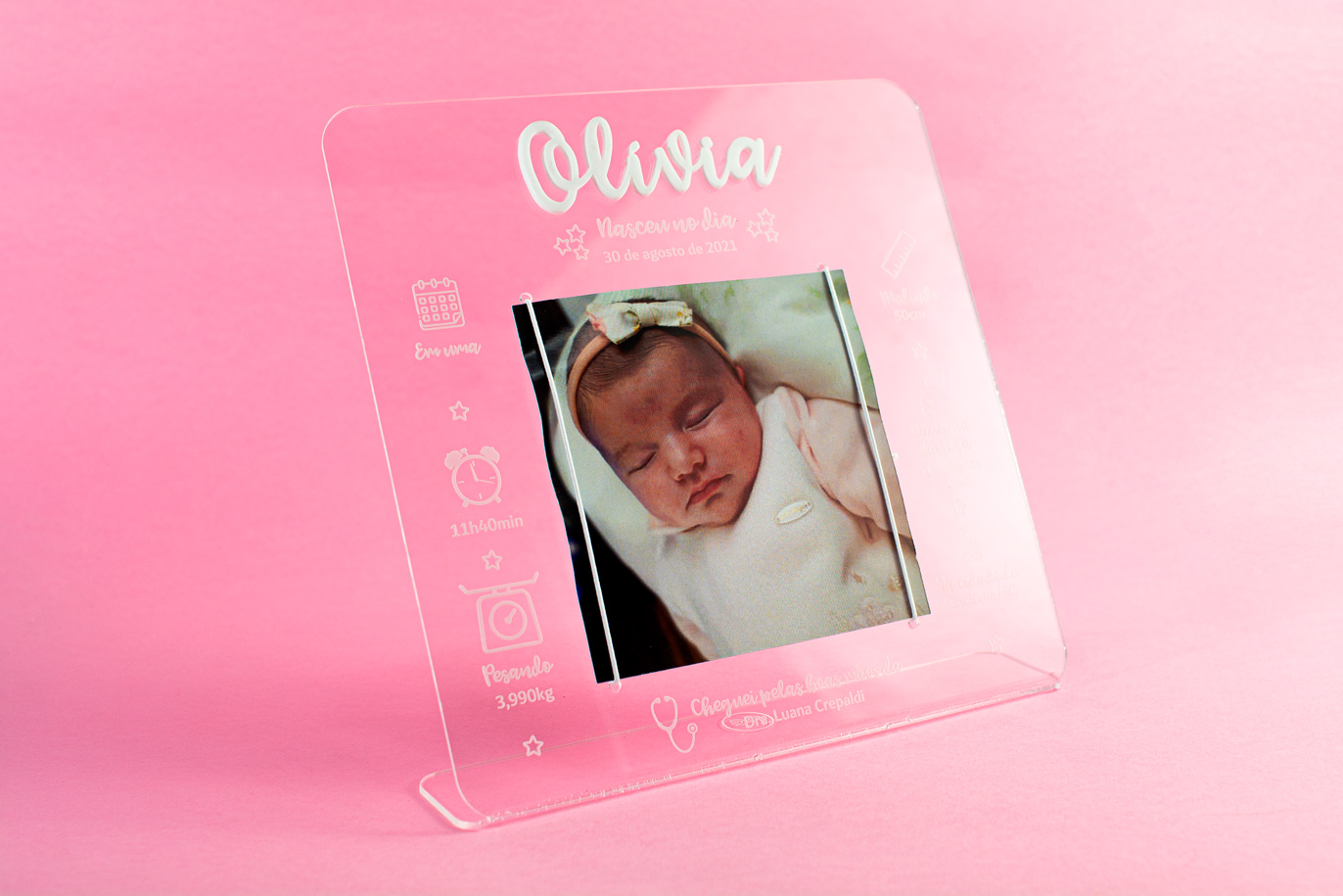 O Retrato RN é um quadro personalizado de nascimento feito com todo o carinho para registrar os primeiros detalhes do seu bebê — nome, data, hora, peso, altura, cidade, nome do médico e até uma linda foto.