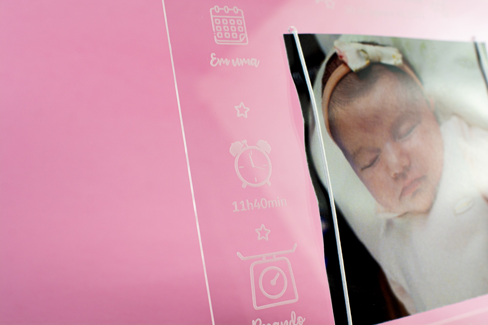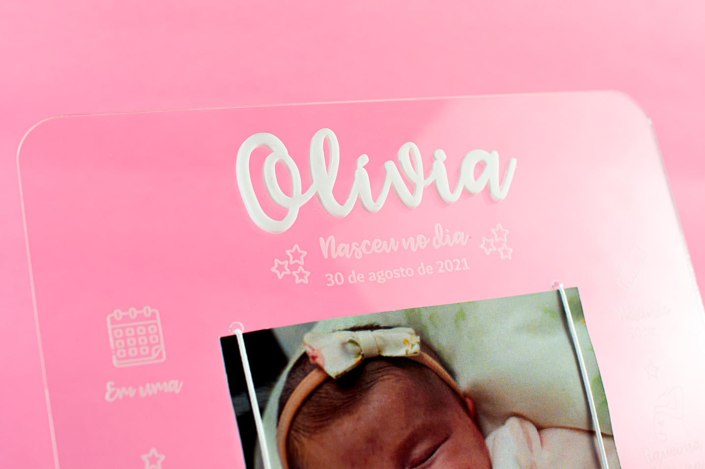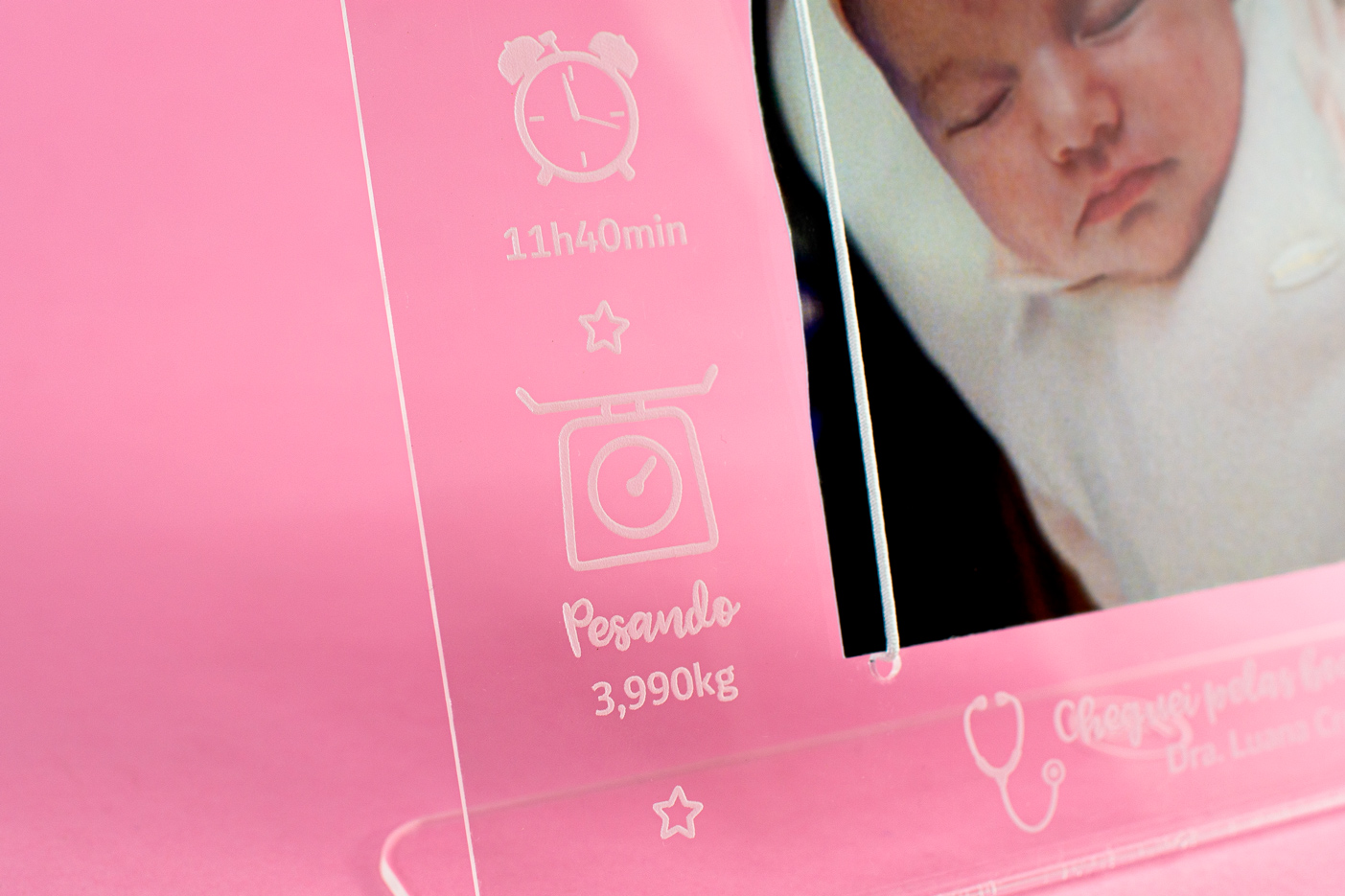 O Retrato RN é um quadro personalizado de nascimento feito com todo o carinho para registrar os primeiros detalhes do seu bebê — nome, data, hora, peso, altura, cidade, nome do médico e até uma linda foto.